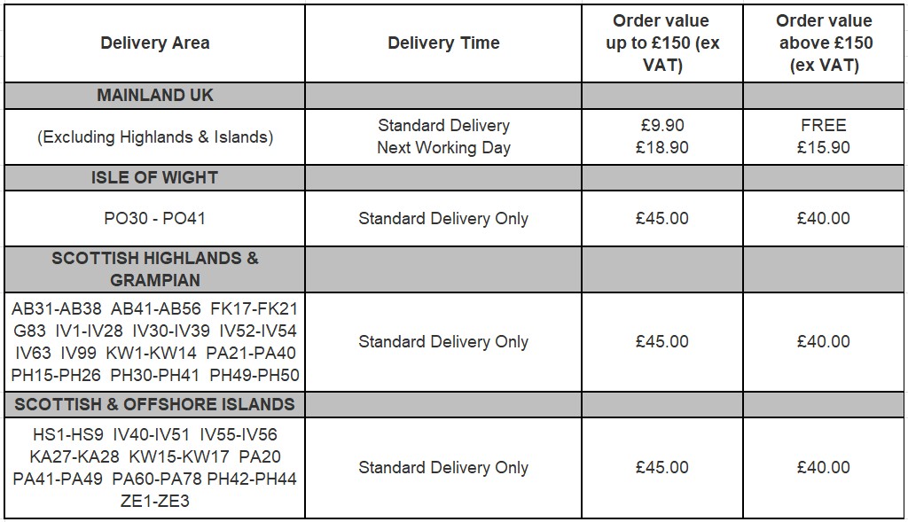 The cut off time for which orders will be processed is 3.00pm. If you place an order before this time it will processed and despatched within 1 working day (subject to stock availability). Orders received after 3.00pm will be processed and dispatched within the following 1-2 working days. Next Working Day delivery on items showing a lead time will be delivered on an Next Working Day service as soon as these goods are received in stock.